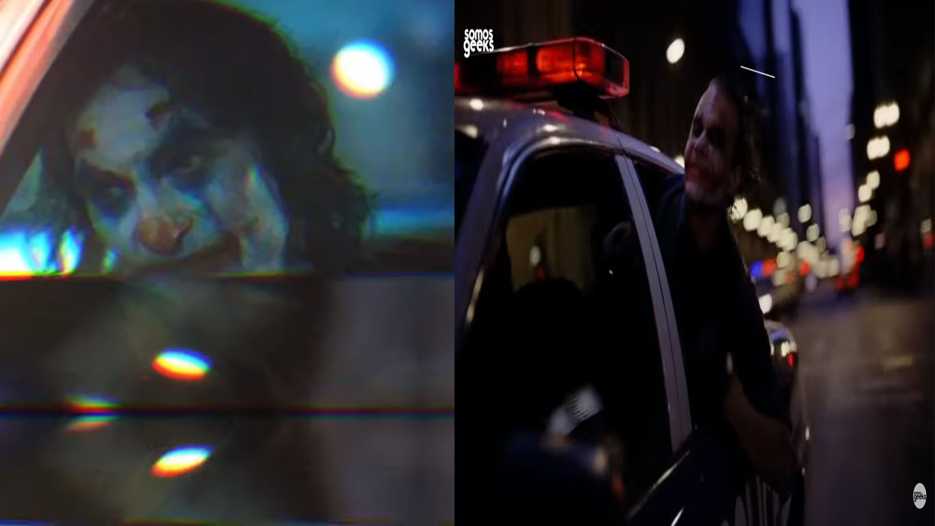 El otro Joker que aparece en escena de una manera implícita es el del actor Heath Ledger -uno de los mejores en mi opinión- en donde ambos personajes contemplan la ciudad de Gotham, oscurecida por la noche, en una patrulla de policía. Sin embargo, esto no acaba aquí, sino que Joaquin Phoenix dice una frase inspirada en el Joker de Ledger: "¿acaso parezco un payaso con un plan?". Con esto dando a entender, en ambos casos, que los dos personajes no son de planear las cosas, sino más bien de actuar sin pensar.